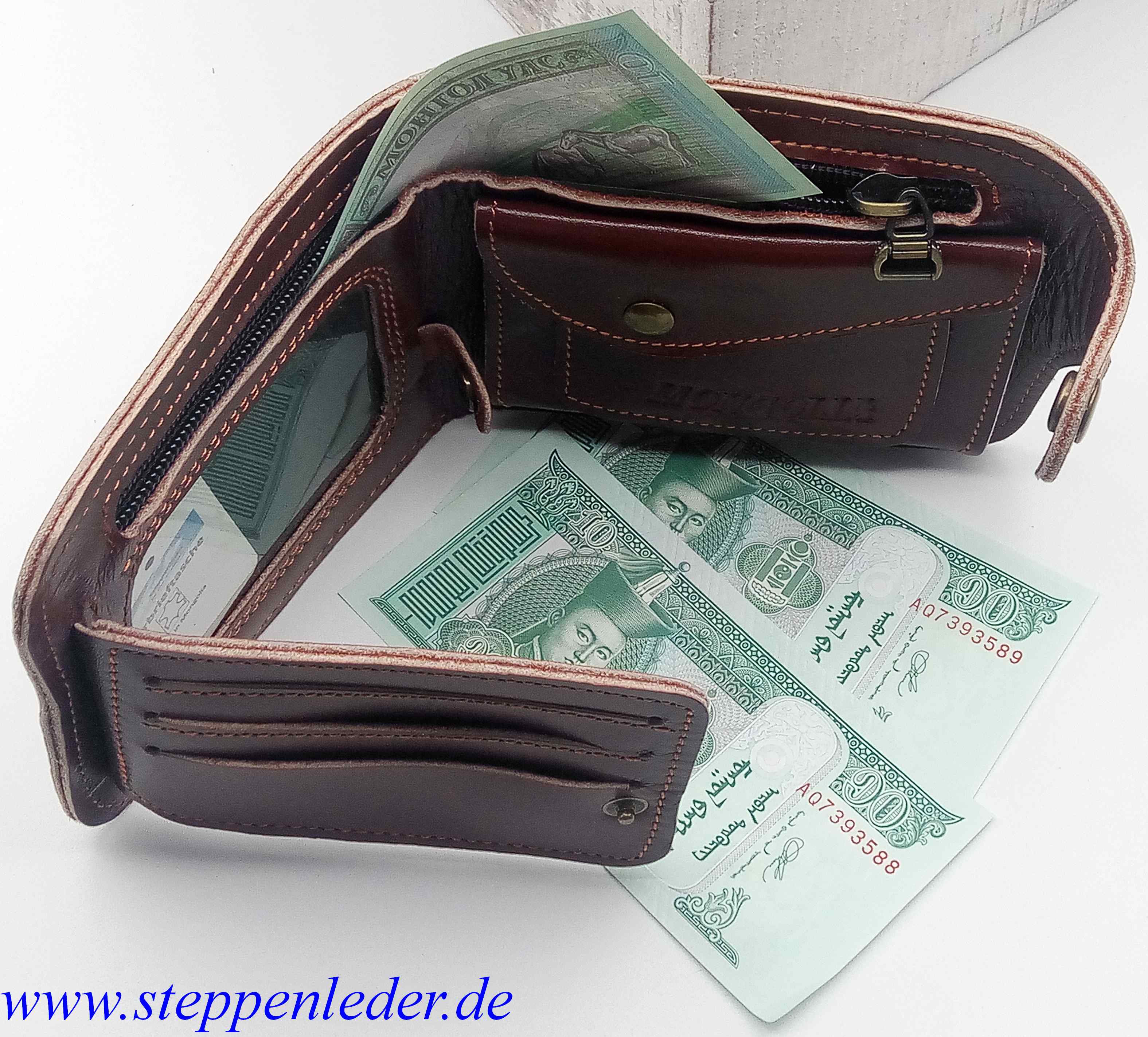 Ein Fach für Geldscheine und ein durch einen Reißverschluss verschließbares Fach.